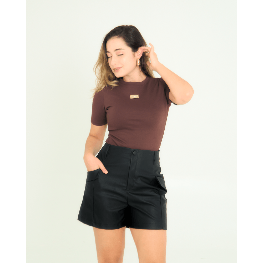 Modelo: Blusa feminina com detalhe em metal com nome da marca, gola redonda, mangas curtas.