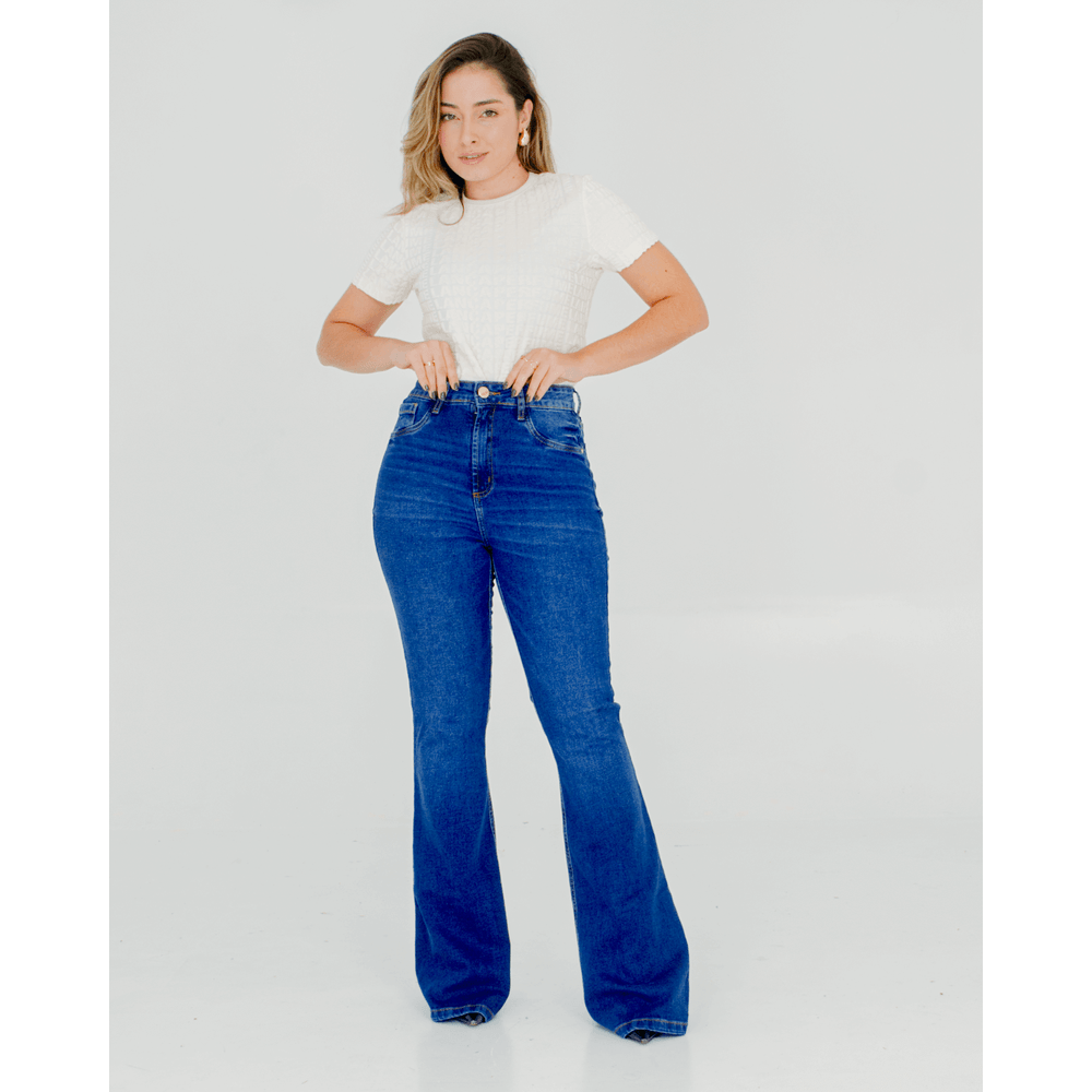 Modelo: calça jeans feminina, modelo flare, lavagem escura, cintura alta, possui bolsos, cós tradicional, fecho em zíper e botão.