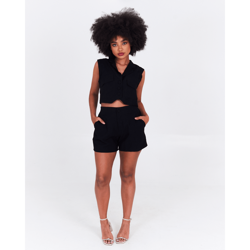 Marca: Tropical Indicado para: Happy Hour Modelo: conjunto feminino duas peças; cropped, fecho frontal em botões,possui bolsos frontais, sem mangas, gola colarinho; Short liso, cós liso com fecho em botão e ziper e elástico nas costas e possui bolsos.