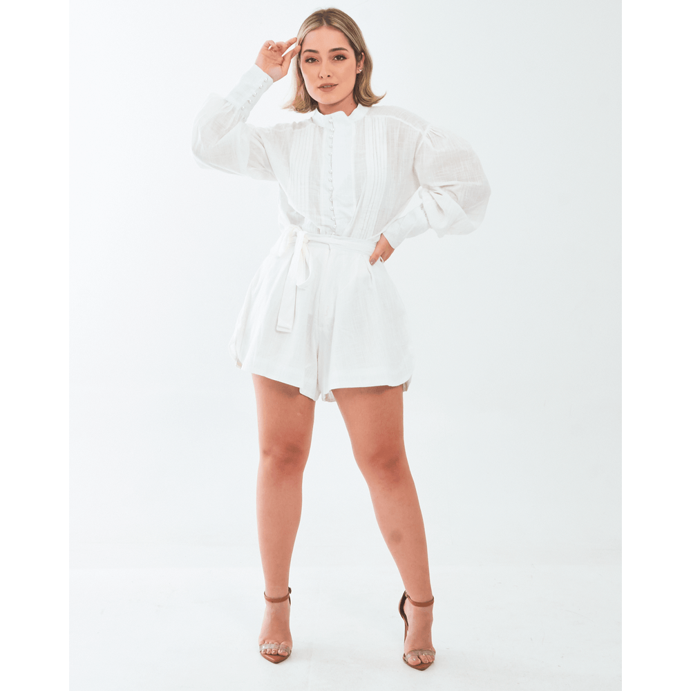 Marca: Top Charme Indicado para: Casual ou Happy Hour Modelo: conjunto feminino duas peças; blusa lisa com fecho frontal e botões perolados, manga longa e gola alta; short liso, cós tradicional, fecho em zíper e botão forrado e acompanha cinto faixa.
