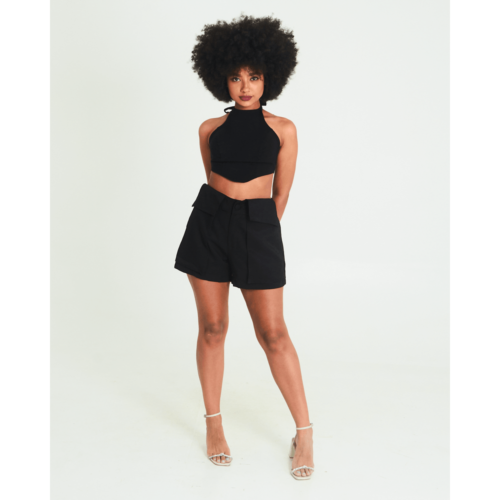 Marca: Tropical Indicado para: Happy Hour Modelo: conjunto feminino duas peças; cropped liso, amarração no pescoço e nas costas, possui bojo e barra assimétrica; Short liso, cós tradicional com fecho em botão e zíper, possui bolsos.