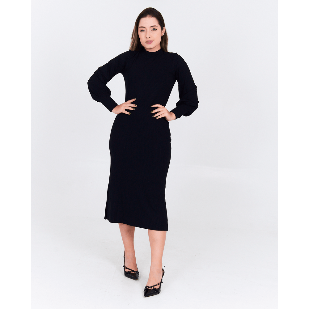 Modelo: vestido feminino canelado, comprimento midi, mangas longas com punho, gola alta e fenda nalatetral.