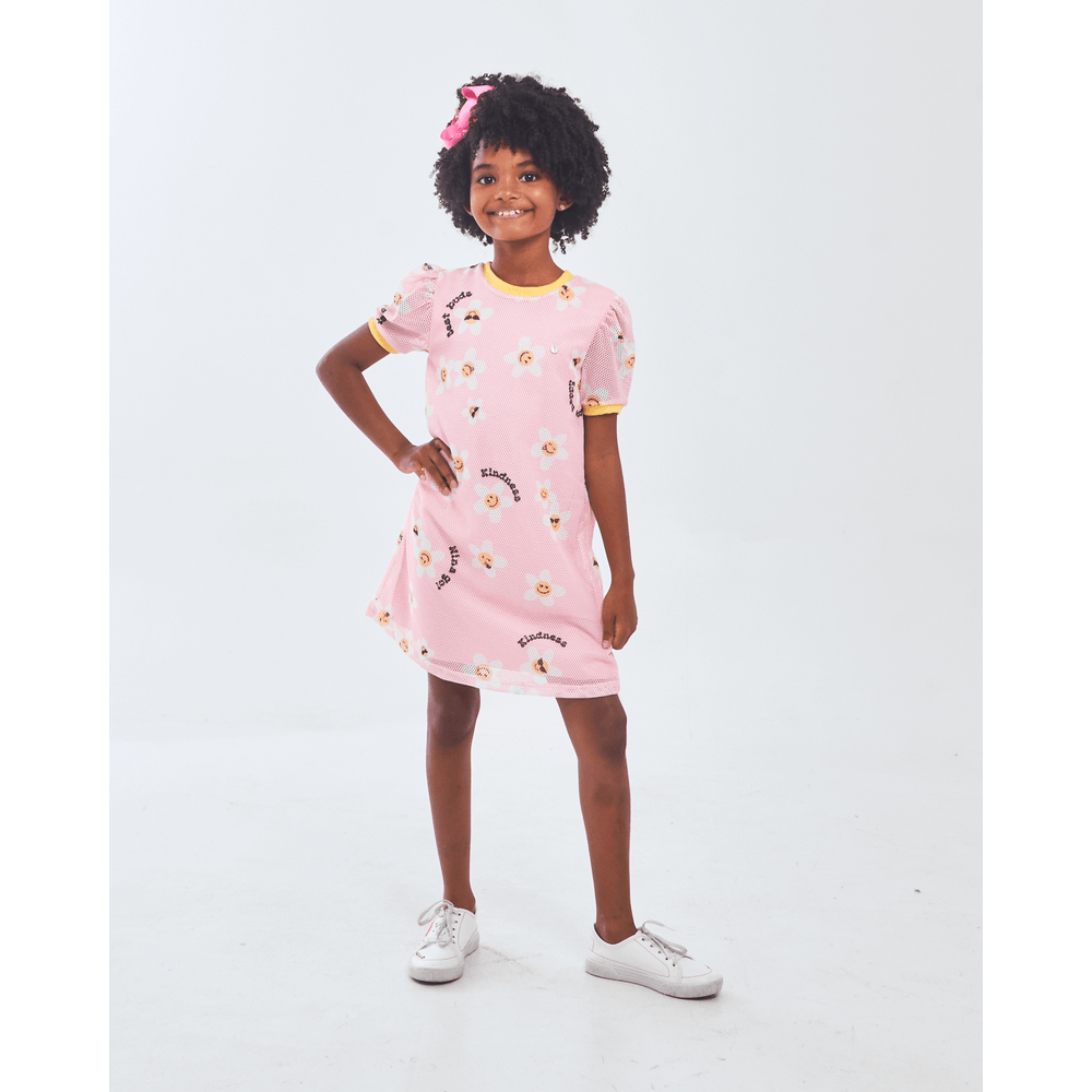 Modelo: vestido infantil em tela estampado, possui forro, gola canoa e mangas curtas.