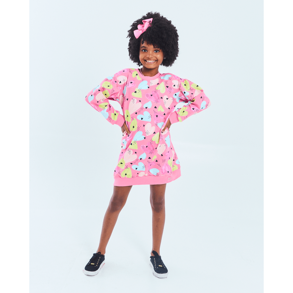 Modelo: vestido infantil estampado, gola canoa, mangas longas em punho.