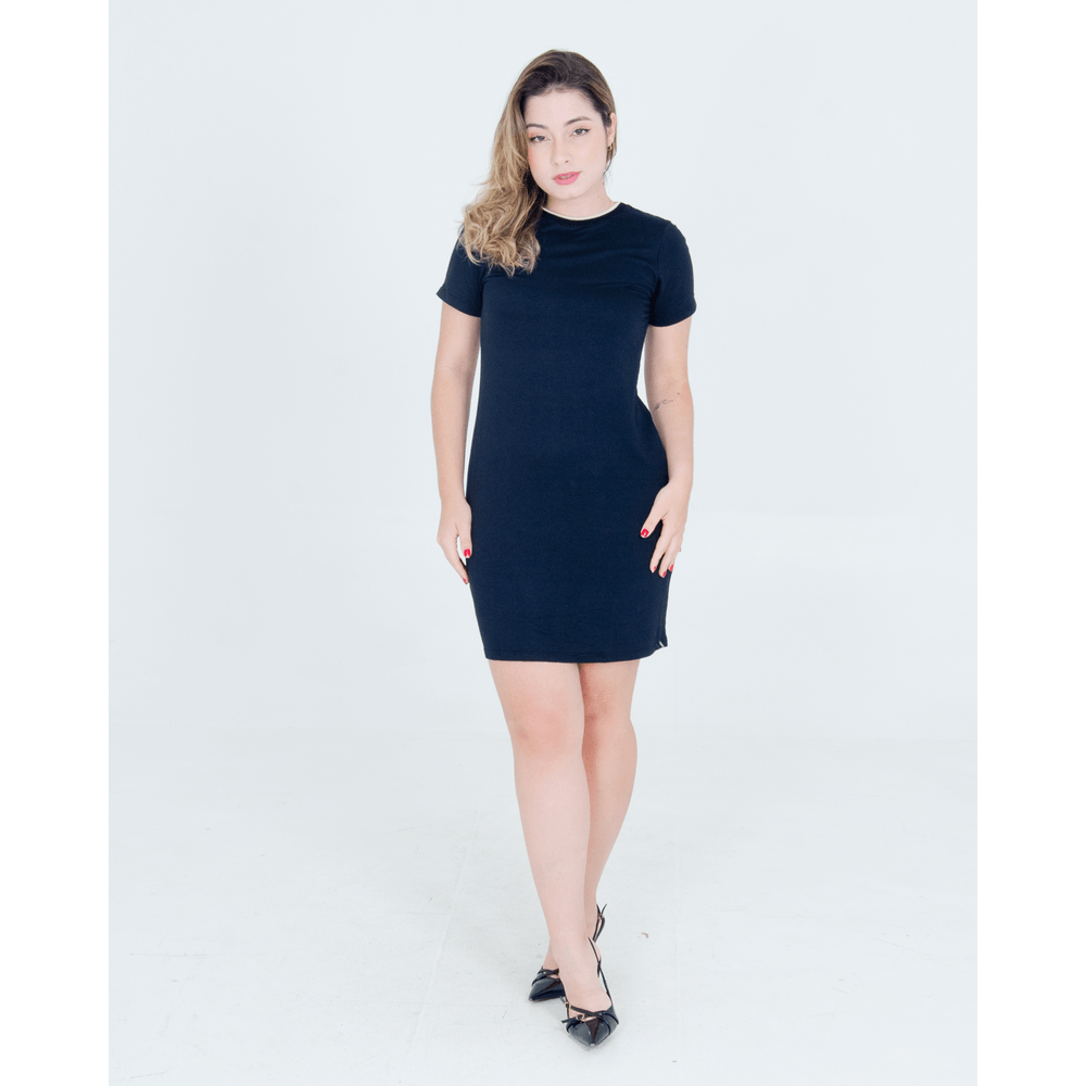 Modelo: Vestido liso, comprimeto curto e gola redonda.