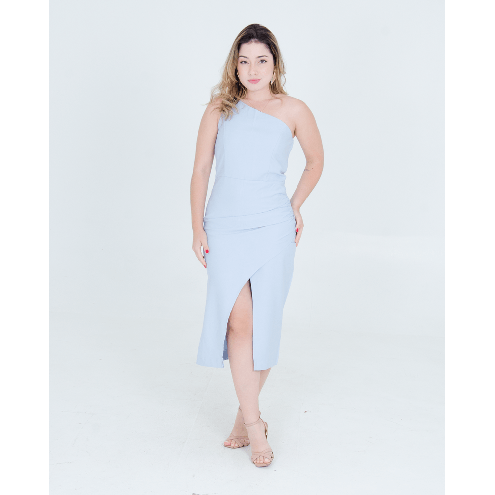Marca: Mi & Co Indicada para: Casual ou Trabalho. Modelo: Vestido feminino liso, comprimento midi, ombro único, fendas frontal, fecho em ziper nas costas.