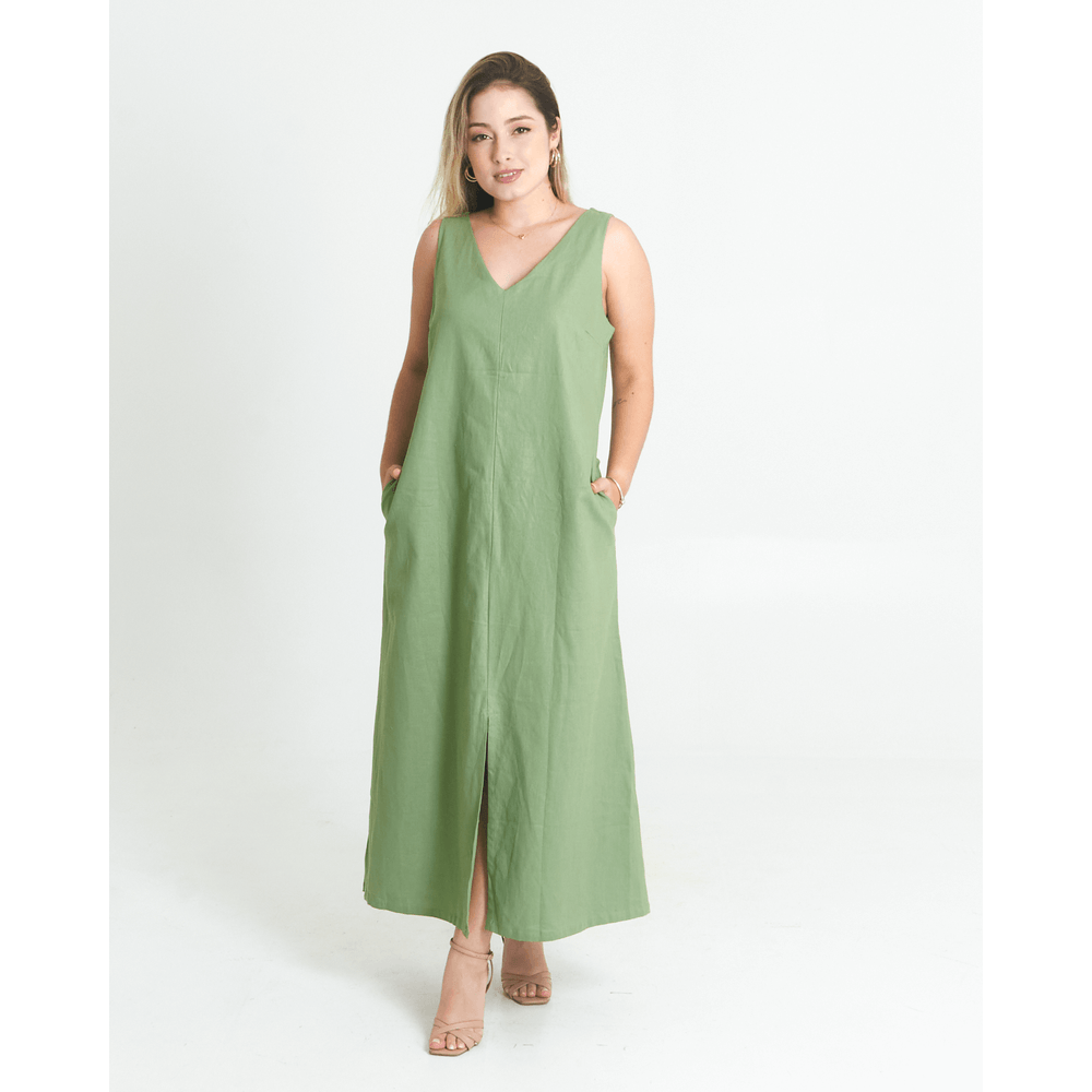 Modelo: Vestido feminino liso, comprimento midi, alças tradicionais, possui bolso faca e fenda frontal.