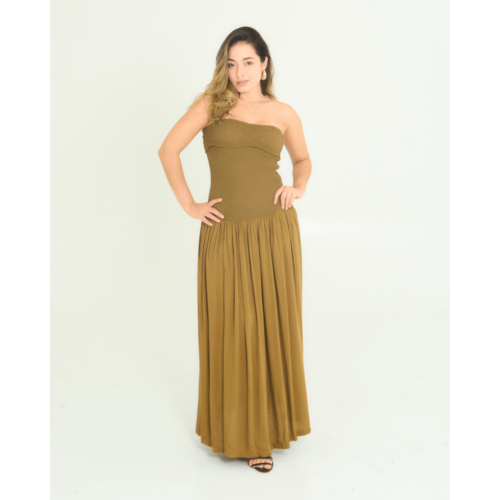 Marca: Maria Dondoca Indicada para: Casual, eEventos formais e noturnos. Modelo: Vestido feminino longo, tomara que caia, parte superior possui acabamento franzido com elasticidade; Saia longa com caimento fluido e leve.